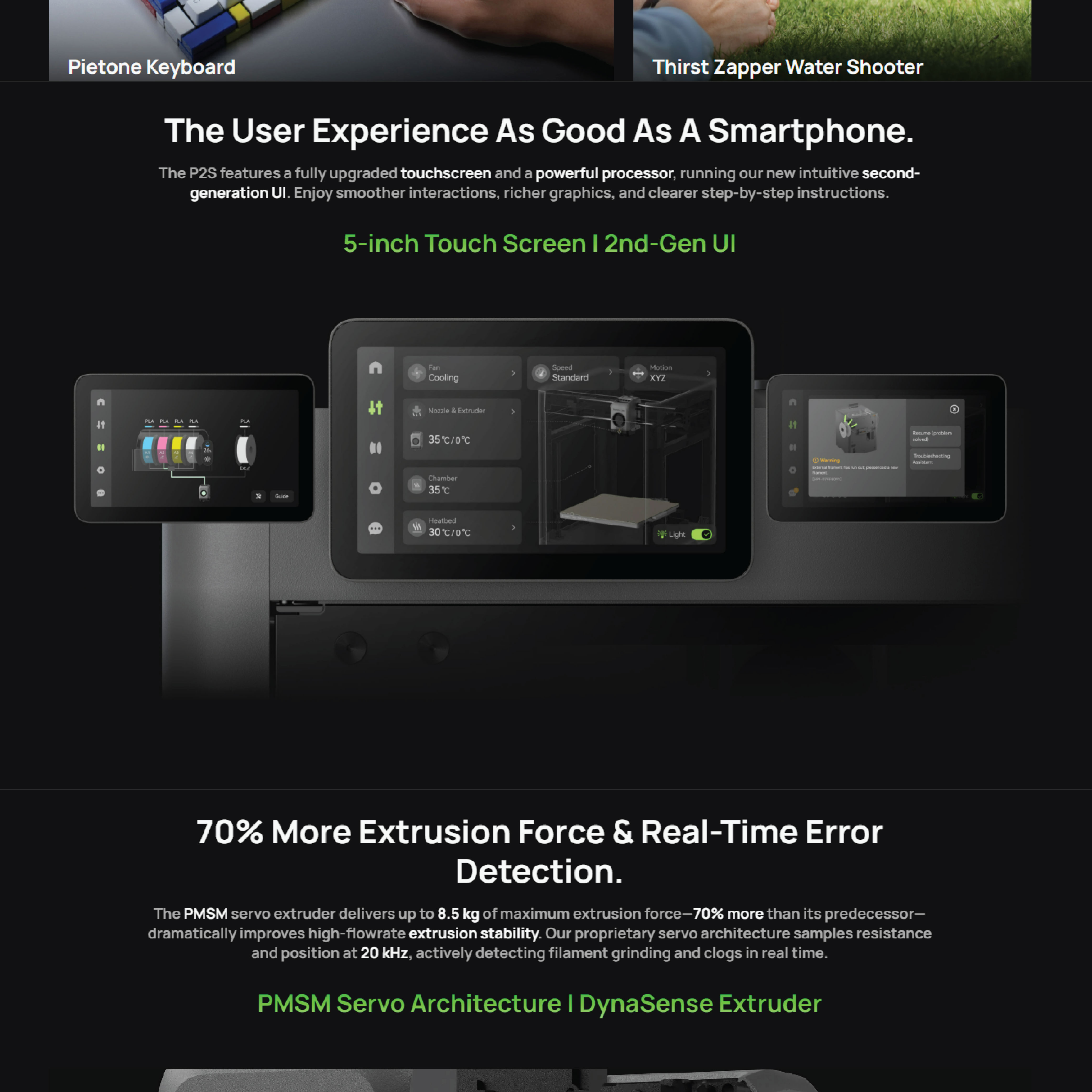 The P2S evolves the best-selling CoreXY platform with flagship-tier features: a powerful PMSM Servo Extruder, an all-new 5-inch Touchscreen UI, and AI Error Detection. Experience lightning-fast, multi-material FDM 3D printing with unparalleled precision and peace of mind.